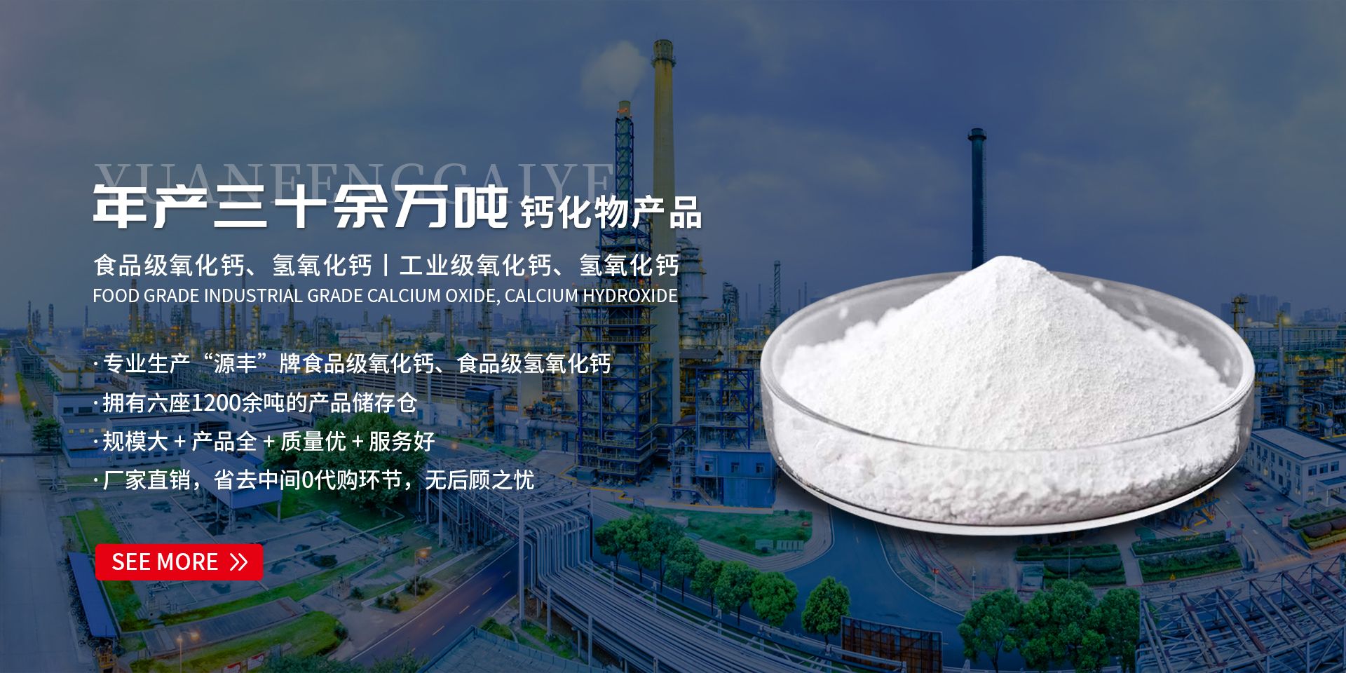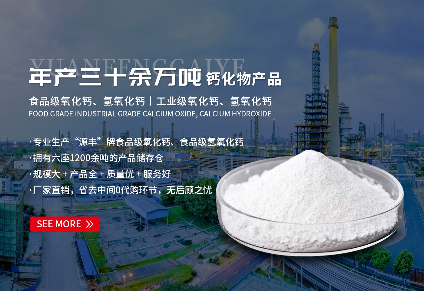 新鄉市源豐鈣業有限公司位于河南省新鄉市鳳泉區。北靠太行山脈,南鄰京廣鐵路,毗鄰京珠高速、石武高鐵,距新鄭國際機場僅80公里,物華天寶,人杰地靈。太行山蘊藏豐富的石灰石資源、便捷的交通、發達的物流,使源豐鈣業在鈣化物領域蓬勃發展。  公司成立于2006年6月,占地6萬多平米,生產廠房2萬平米,現有員工70余名,中\高 級技術人員20余名,是一家集科研、生產、銷售為一體的大型鈣化物生產企業,產品有工業級氧化鈣、氫氧化鈣、鈍化氧化鈣、灰鈣和食品添加劑氧化鈣、氫氧化鈣等。先進的生產技術、高精度的檢測儀器和ISO9000質量的嚴格管理,為年產三十余萬噸的優良產品提供保障,為年產三十余萬噸的優良產品提供了保障,高質量的產品、優良的團隊,現代化的管理和完善的售后服務.使得“源豐”產品暢銷大江南北及國際市場,并獲得較高贊譽。  “源豐”人愿以極大的聰明才智、滿腔的熱情,以“奉獻社會、發展自身”為宗旨,攜手八方仁人志士,同創共進、共同繁榮!竭誠歡迎國內外新老用戶共聚“源豐”磋商洽談業務。